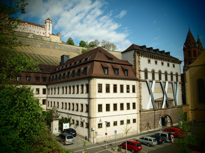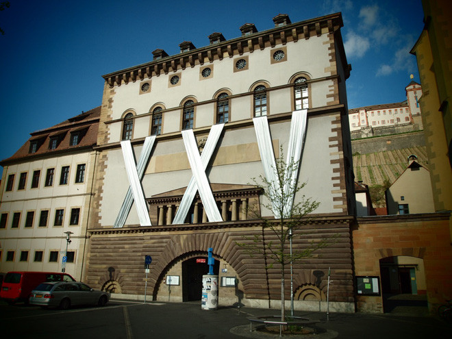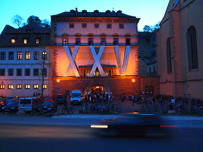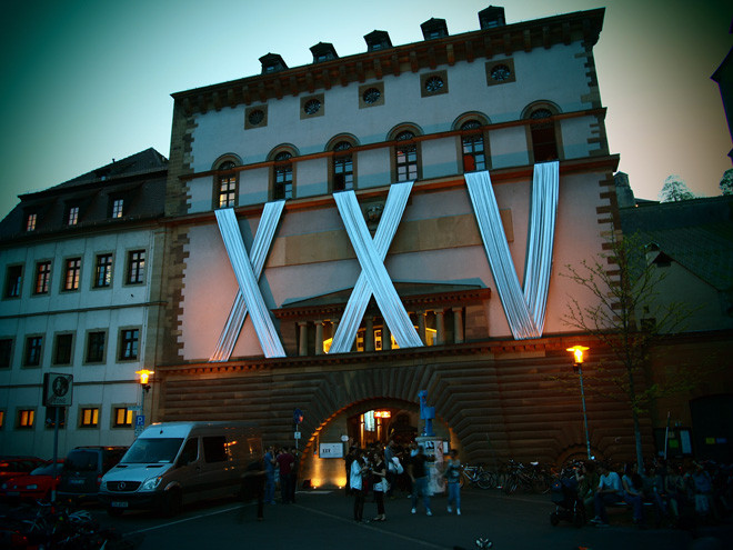 XXV – die lateinischen Ziffern für die Zahl 25 – zieren in großen Lettern die Fassade des historischen Gebäudes und weisen eindrucksvoll auf den 25. Geburtstag des Würzburger Jugendkulturhauses hin.