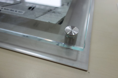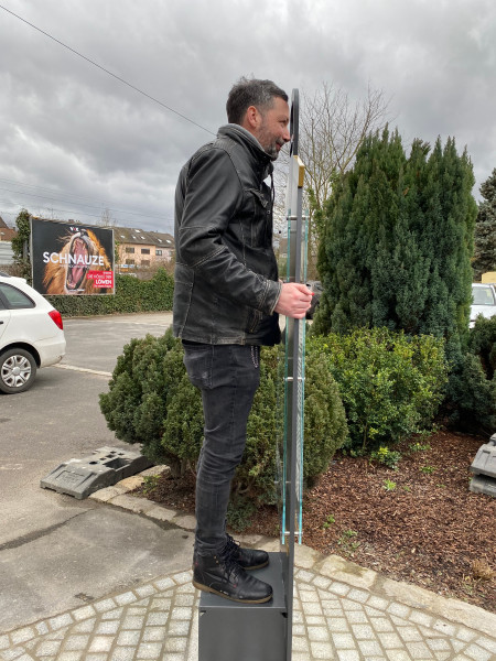 Probemontage der Wandschilder mit bedruckter Glasscheibe