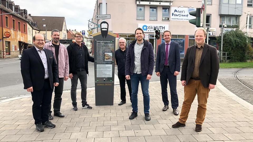 Informationsstele am Stadteingang; Pressetermin am 20.10.2021 (von links): Udo Feldinger (Stadtrat), Matthias Braun (Architekt BDA), Christian Rudolph (Dipl. Designer FH), Stefan Rettner (Vorsitzender Bürgervereinigung Heidingsfeld e.V.) André Dorscheid (FB Stadtplanung), Benjamin Schneider (Stadtbaurat), Dr. Axel Metz (Leiter des Stadtarchivs). Foto: ProStadt/Massimo Falabretti