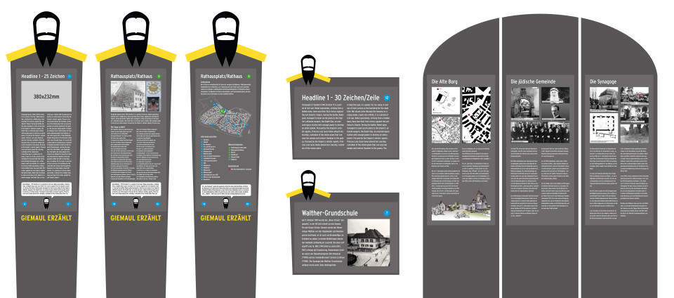 Das Leitsystem besteht aus 18 Schildern im Format 60x40cm, 6 Stelen im Format 200x60cm und einer Gedenkstele im Sonderformat 200x240cm. Alle Beschilderungen sind in 15 mm verzinktem Stahlblech in DB 703 Lackierung ausgeführt. Die Schulterstücke der Stelen sind goldfarben, Haare und Bart schwarz lackiert. Die Informationstexte und Bilder sind rückseitig auf eine ESG Glasscheibe 10 mm mit keramischem Digitaldruck farbig gedruckt und mit Punkthalterungen aus Edelstahl montiert. Die Stelen tragen jeweils eine Scheibe auf der Vorder- u. Rückseite. Die Schilder und Gedenkstelen sind nur vorderseitig mit Scheiben bestückt. Die Stelen sind zusätzlich auf der Vorderseite mit einem goldfarbenen Schriftzug „GIEMAUL ERZÄHLT“ auf 2 mm Alublech beschriftet und besitzen ein rückseitiges Trittblech aus verzinktem Stahlblech.