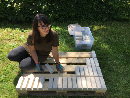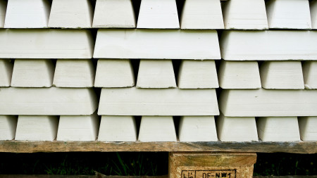 Die Barren werden für die Ausstellung auf einer Europalette aufgestapelt präsentiert und im Freien dem Verfall durch Witterung bewußt ausgesetzt.